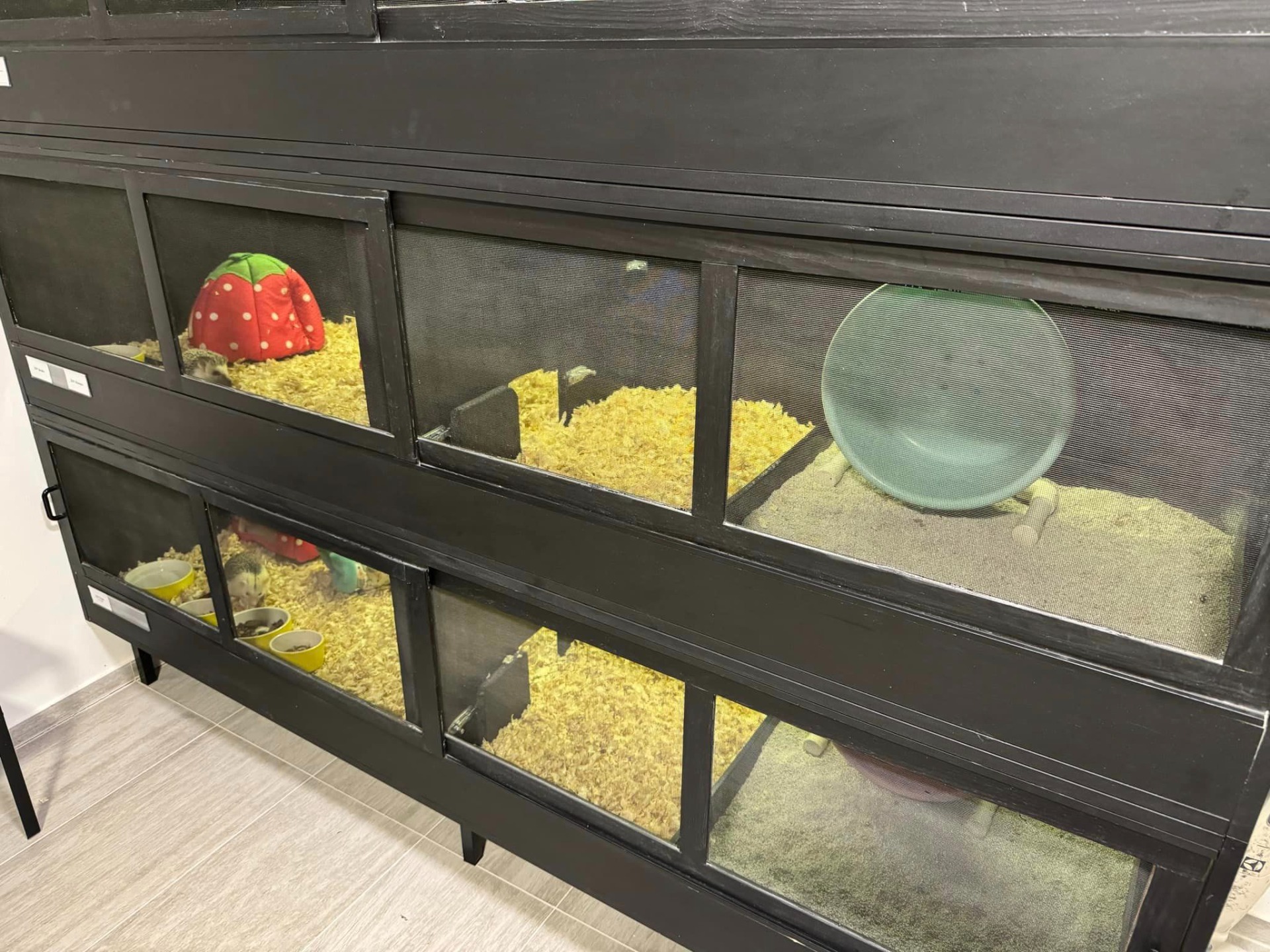 Od roku 2021 máme ježečky v nových velikých viváriích o rozměru 200 x 60 cm, které je v případě nutnosti možné i přepůlit, obvykle ale máme celé patro spojené. Díky velkým záchůdkům s kočkolitem se ježkům dobře udržuje čistota a velká plocha terária umožňuje chov i více samiček pohromadě.